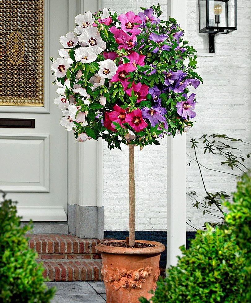 To create the special effect of three colours on one tree, three varieties are skilfully grafted in the nursery as they are grown creating an unusual upright tree with a straight stem topped with branches that each carry different colour flowers.