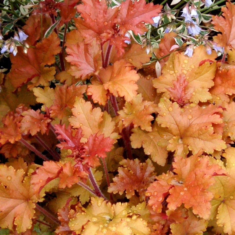 Heuchera ‘Marmalade’ is a stunning plant, with rich, shiny, undulating foliage in a full array of marmalade colours, with contrasting hot pink undersides.Â