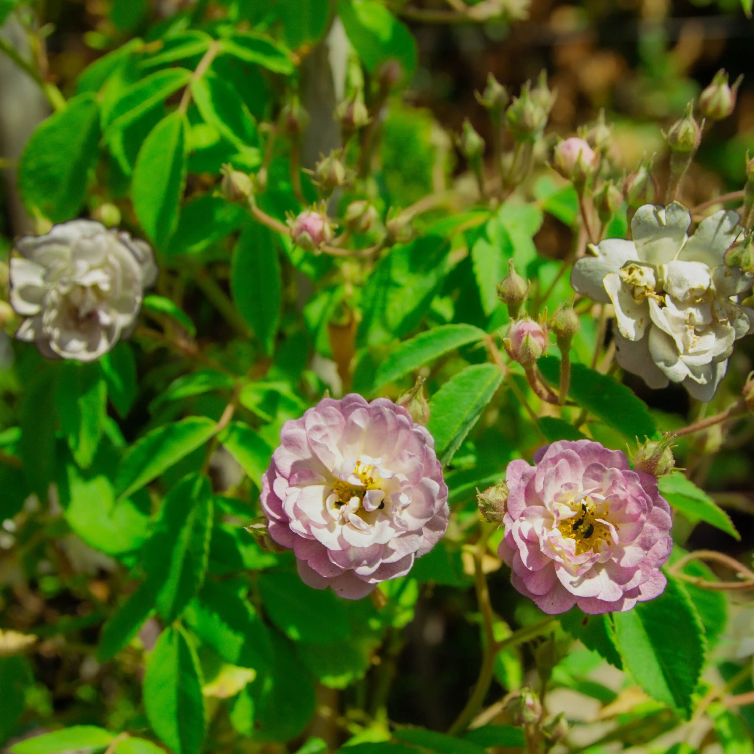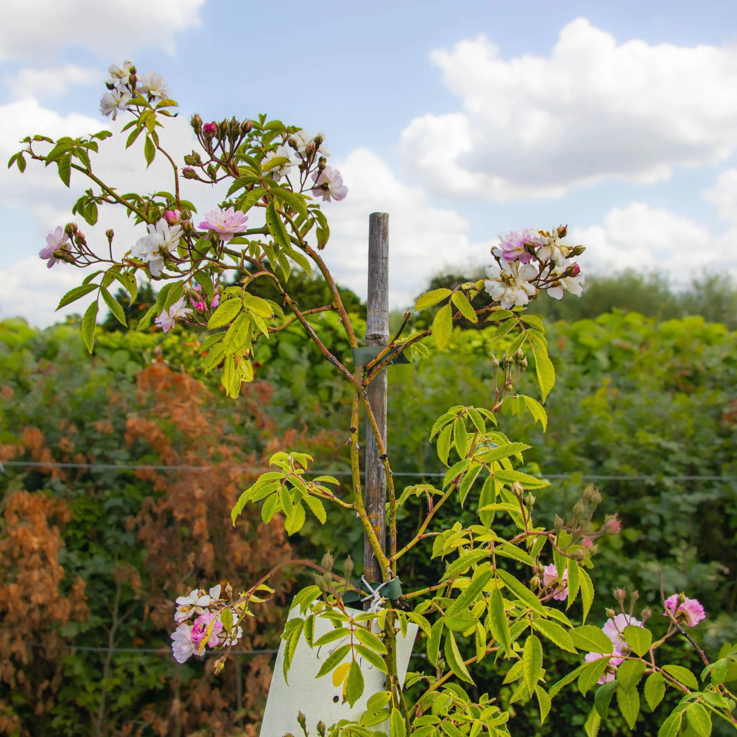 A typical rambling cottage garden Rose that works its socks off for you in the garden. Bright green glossy leaves provide the backdrop for numerous tiny pinky white flowers that will persist throughout the summer, the stems are almost thornless making it safe to plant around a family garden and in turn they can all enjoy its fragrance. Come the end of the summer this Rose will form small round orange red fruits that compliments its autumn colour. ‘Guirlande Rose’ likes a sunny spot will accept some dappled shade and it is tolerant of all soils apart from those that waterlog. A good thick mulch of well-rotted manure In early spring will be a just reward for such a fantastic plant.