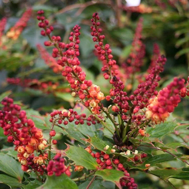 These brightly coloured blooms appear initially as elegant racemes smothered with vividly coloured orange-red buds that open from the base of the spike to reveal cheerful yellow flowers. Once the flowers have faded bluish-grey berries form which contrast beautifully with the winter foliage. This really is an amazing new colour introduction to the Mahonia range. Supplied in approx. 2-3 litre containers, full or buds and flowers in season.