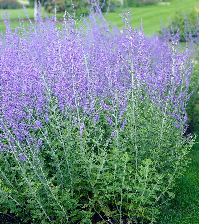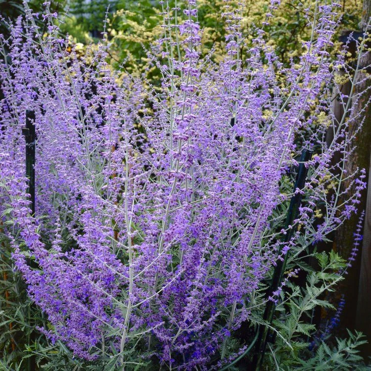 The combination of flowers and foliage means this Perovskia lends itself well as a companion to all kinds of late-summer ornamental grasses and perennials such as Stipa and Japanese Anemone. It looks really good planted in groups or en-masse, try alongside a path where the sage-like fragrance of its leaves can be appreciated. It also associates really well with silver-leaved plants, or in bold swathes in a sunny border.