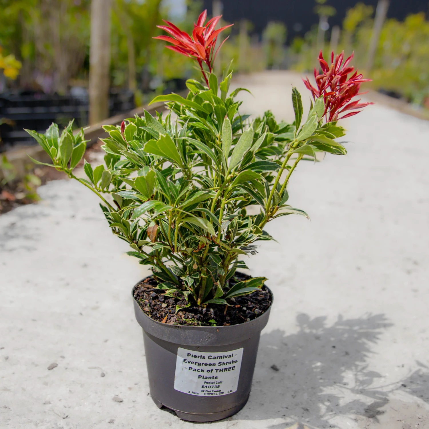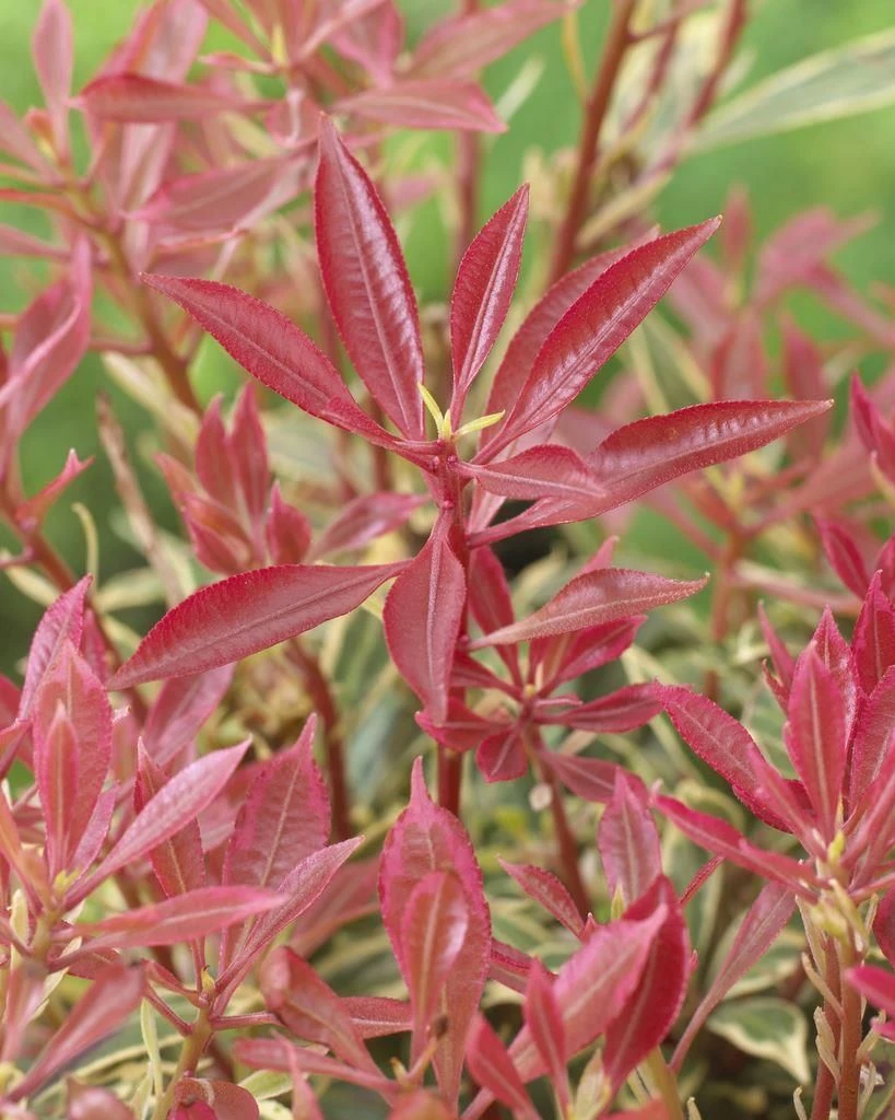 An introduction from Holland, this is a compact upright evergreen shrub with glossy leaves – bright red when young then pink and finally green. All the time with a creamy white variegation. Superb. Ivory white flowers in Spring. Absolutely brilliant, very bushy flowering sized plants in approx 1 litre containers.