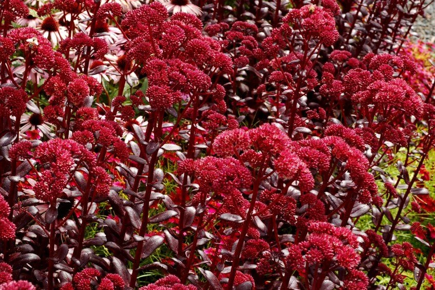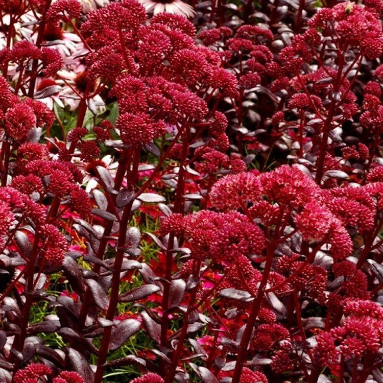 This amazing new perennial Sedum is one of the darkest leafed forms available producing amazing shiny glossy red-brown to purple-brown leaves. The fleshy foliage is topped by Rose-red flowers from late summer in to Autumn, providing a lovely contrast.
