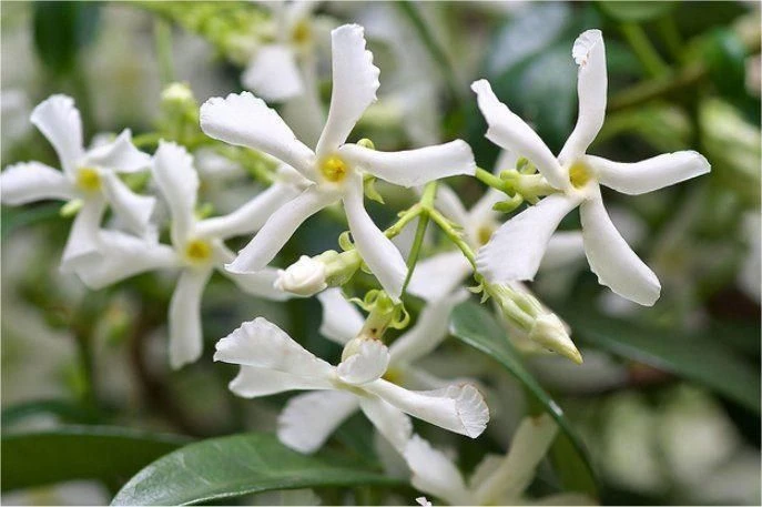 Will climb over fences, trellis, walls, arbours and more Star Jasmine, or Trachelospermum is an attractive woody, evergreen climber with rich, dark green leaves which turn bronze in winter. Highly fragrant, pure white flowers are produced from mid-late summer. It is best grown against a warm, sunny wall and is an excellent plant for adding a touch of scent and high-rise glamour into courtyards, climbing over garden structures in a sunny spot. Especially lovely in warm sunny borders at the foot of a sheltered south-facing wall, this plant will thrive in well drained soils, and is particularly tolerant of hot summer weather where other climbers may flag.